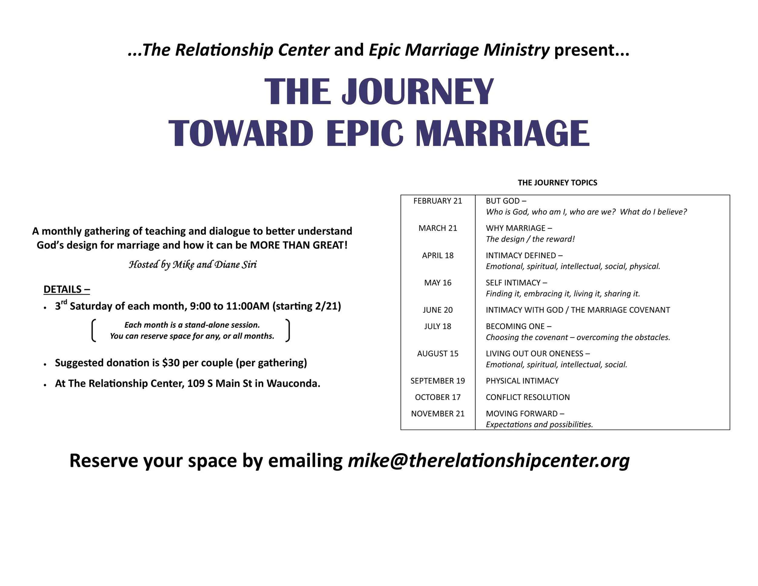 We (Mike and Diane Siri) realized we had been deceived into believing we should be content with a good marriage - when God created it to be EPIC. We received a new revelation of what marriage was created to be, and began to pray and talk about what that looked like and how to achieve it. Through a journey of growing in intimacy with our self, with God and then with each other, we discovered the joy that is available when we pursue God’s plan instead of the world’s. An ever increasing joy!